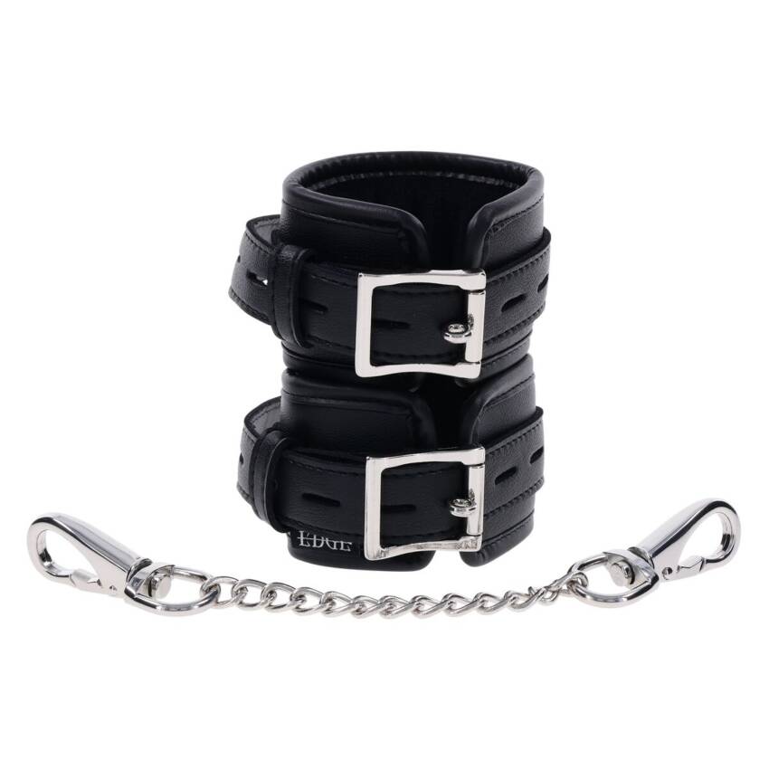 EDGE™ Handcuffs — padded buckle cuffs with sturdy D-rings. Vegan leather (PU) and metal hardware; nickel-free design for comfort and durability.