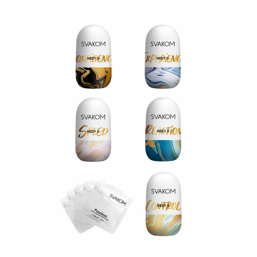 The SVAKOM Hedy X Set includes five disposable, textured stroker sleeves for on-the-go use. Each sleeve is pocket-sized and comes with lube sachets, providing varied sensations for single-use convenience.